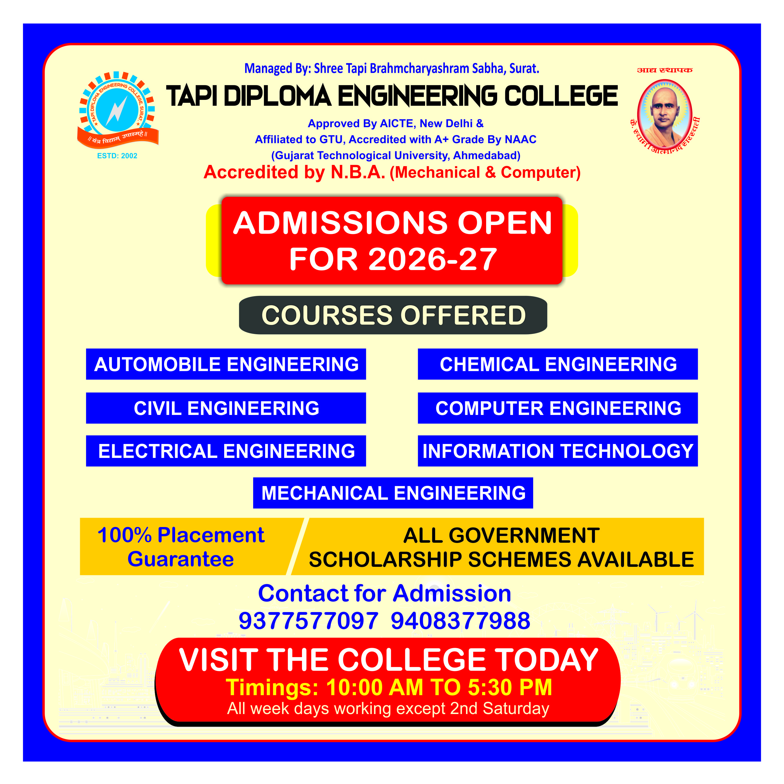 To develop the Tapi Diploma Engineering College into a “Center of Excellence” in the field of Technical Education by: