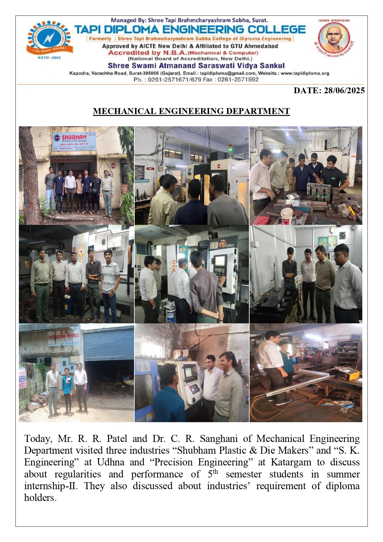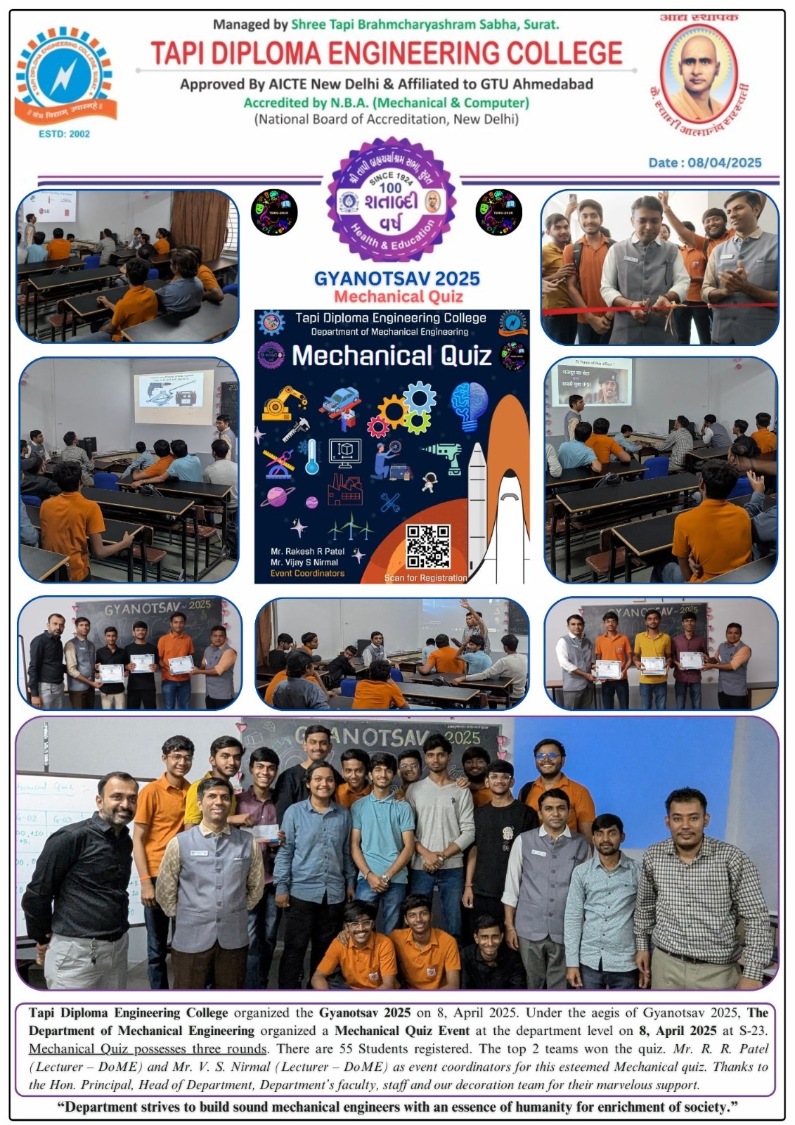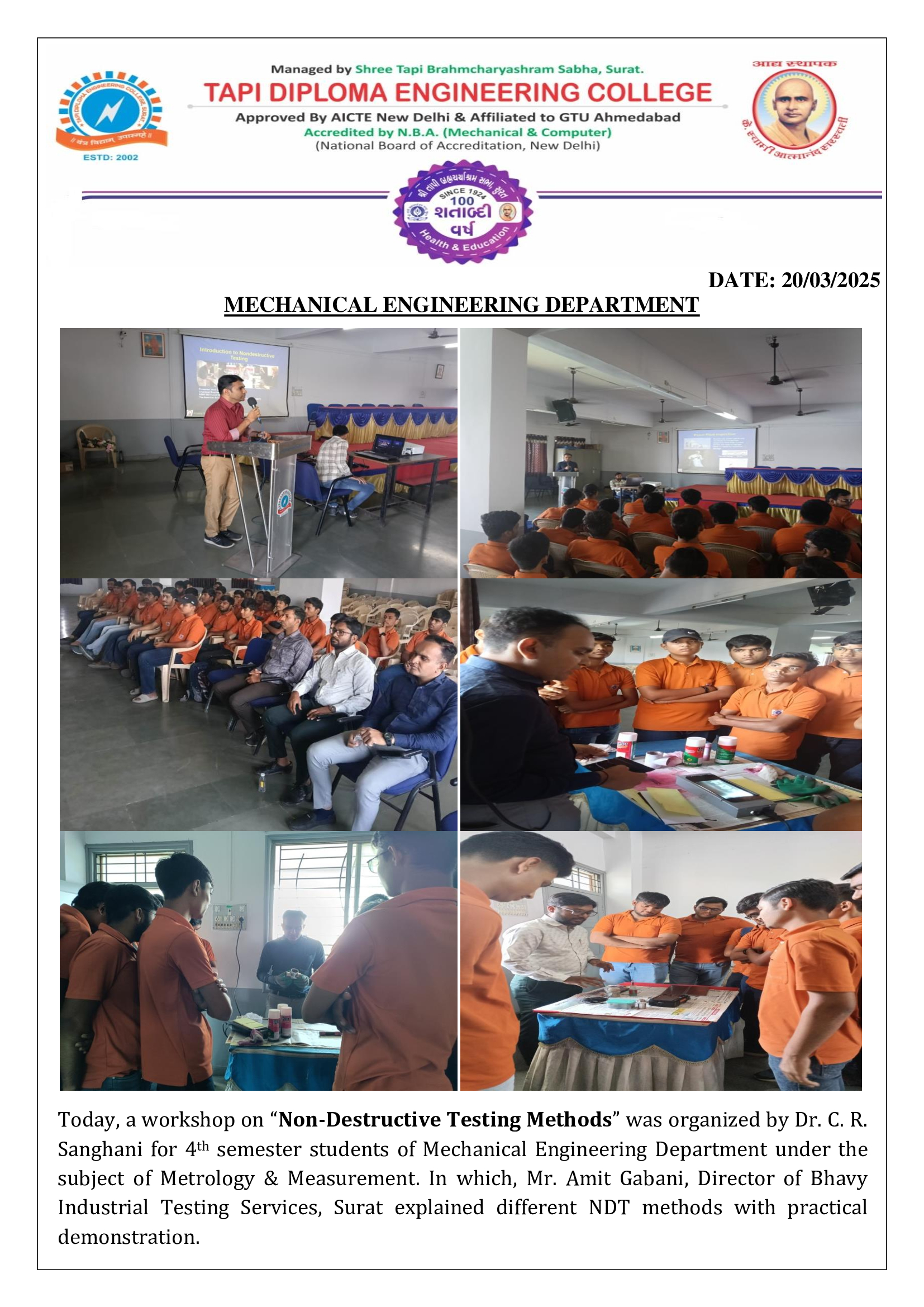 Mechanical and IT Department of Tapi diploma engineering college arranged FDP- faculty development program on “Energy Conservation for Sustainable Development” from 25/11/2024 to 30/11/2024, which is approved and sponsored by ATAL-AICTE, New delhi. In this 6 days faculty development program on various issues related to energy conservation, green and clean technologies, environment and climate change and holistic approach etc. was discussed by the various experts from academic and industries.